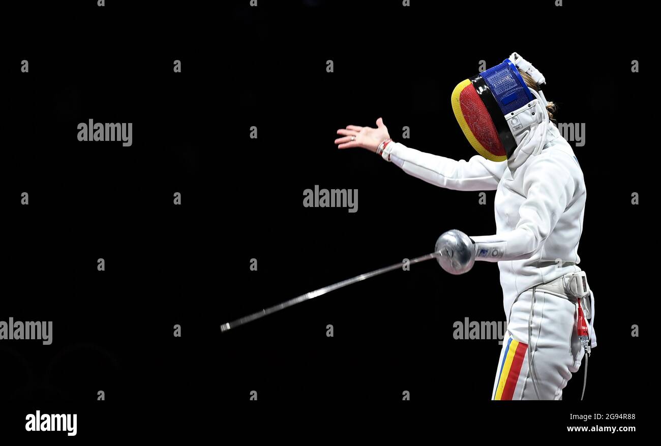 Tokyo 24th July 2021 Ana Maria Popescu Of Romania Reacts During The Women S Epee Individual Final Match At Tokyo 2020 Olympic Games In Tokyo July 24 2021 Credit Zhang Hongxiang Xinhua Alamy Live News